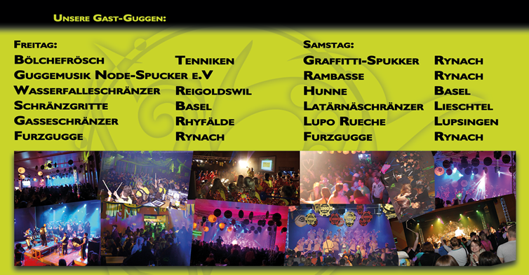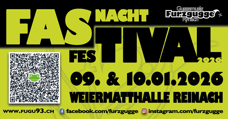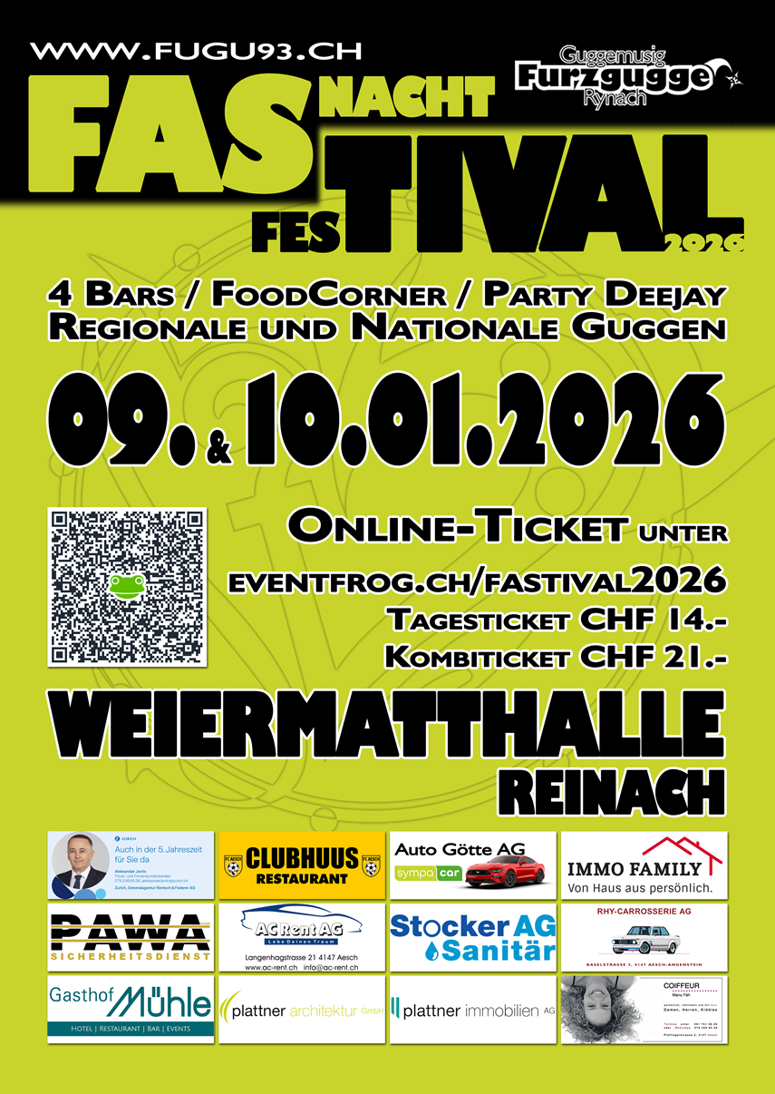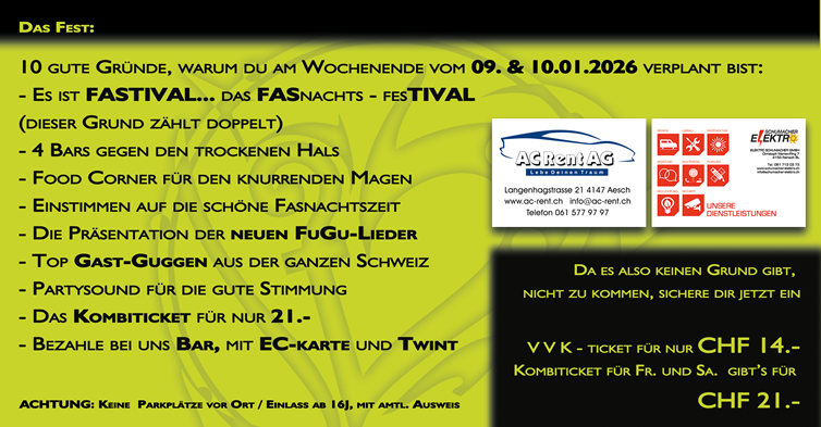 Tickets findest du unter: eventfrog.ch/Fastival2026 10 gute Gründe, warum du am 09. und 10. Januar 2026 verplant bist: - Es ist FASTIVAL... DAS FASnachts-fesTIVAL (dieser Grund alleine würde schon reichen) - Wir stellen euch unser neues Kostüm und unsere neuen Lieder vor - 4 Bars mit Getränken gegen den trockenen Hals - Grosse Auswahl an Essen für den knurrenden Magen - Einstimmung auf eine geile Fasnachtszeit - Top Gastguggen aus der ganzen Schweiz - Partysound für die gute Stimmung - Das Kombiticket für nur 21.- - Bezahle bei uns mit EC-karte oder Twint Unsere Gastguggen: Freitag: Bölche-Frösch Tenniken Guggemusik Node-Spucker e.V Wasserfalleschränzer Reigoldswil Schränzgritte Basel Gasseschränzer Rhyfälde Furzgugge Rynach Samstag: Graffitti-Spukker Rynach Rambasse Rynach Hunne Basel Latärnäschränzer Lieschtel Lupo Rueche Lupsingen Furzgugge Rynach Vorverkaufsticket: Tageskarte nur CHF 14.- (Abendkasse CHF 16.-), Kombiticket für Fr. und Sa. nur CHF 21.- Achtung Funktion Kombiticket: Du scannst am Freitag dein Ticket und erhältst für den Samstag ein physisches Ticket in die Hand. Weniger anzeigen |